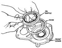 11. Apply a thin coat of oil to front cover (install shim with groove showing). Select a suitable spacer from chart, then assemble spacer to transmission case countershaft front bearing bore.