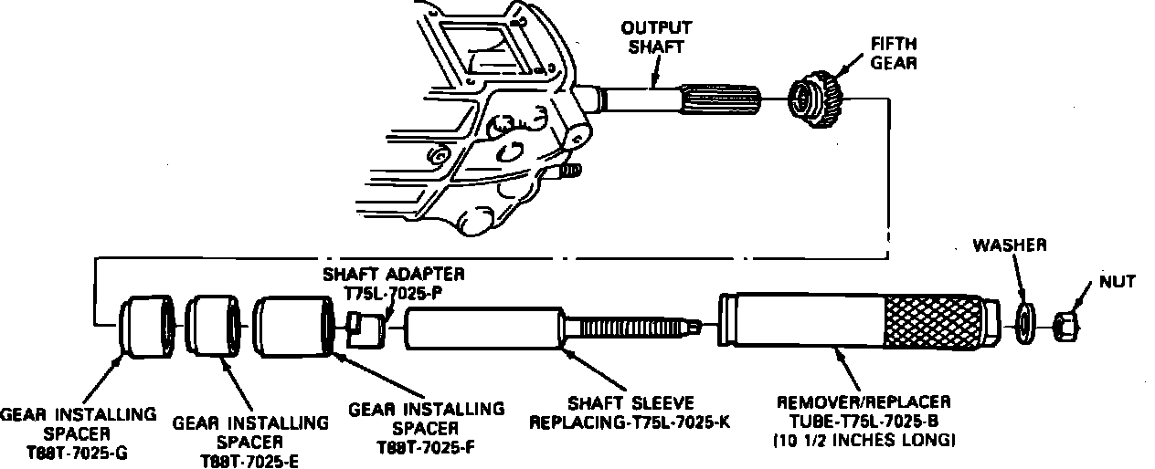 16. Assemble 5th gear to output shaft, using gear installing spacer tool No. T88T-7025-F, shaft adapter tool No. T75L-7025-P, shaft adapter screw tool No. T75L-7025-K, remover/replacer tube tool No.T75L-7025-A (4X4 models), nut and washer or equivalents. Ensure long flange on 5th gear faces forward. To install 5th gear assembly on 4X2 models, perform process in two steps; first install gear installing spacer tool No. T88F-7025-F, then when tool bottoms, add gear installing spacer tool No.T88T-7025-G and press 5th gear assembly the rest of the way into position.