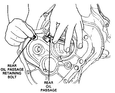 25. Apply suitable sealant to oil passage retaining bolt. Position oil passage to transmission case and install retaining bolt and torque to 6-7 ft lbs.