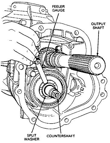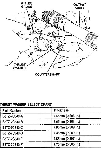 30. Manually press thrust washer forward against shoulder on countershaft, then while maintaining forward pressure, insert feeler gauge between thrust washer and counter reverse gear. Using the chart, determine correct thrust washer to obtain specified end play. counter reverse gear end play 0.25-0.35mm (0.009-0.013 in.). Measure end play.