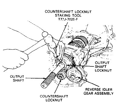 41. Stake locknuts to bottom of shaft groove using Countershaft Locknut Staking Tool T77J-7025-F or equivalent. then install speedometer drive gear and steel ball into output shaft (4X2 models only).
