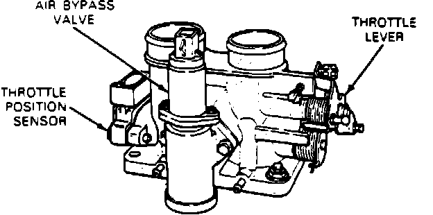 The Throttle Position (TP) sensor, mounted on the throttle body, is a potentiometer that monitors throttle plate angle and sends a signal to the Engine Control Assembly (ECA). The TP sensor contains a pivot arm that moves along a curved resistor. One of the sensor leads supplies a five (5) volt reference signal (sent by the ECA) to the resistor. The second lead is used to ground the resistor. The third lead is for the voltage signal to the ECA.