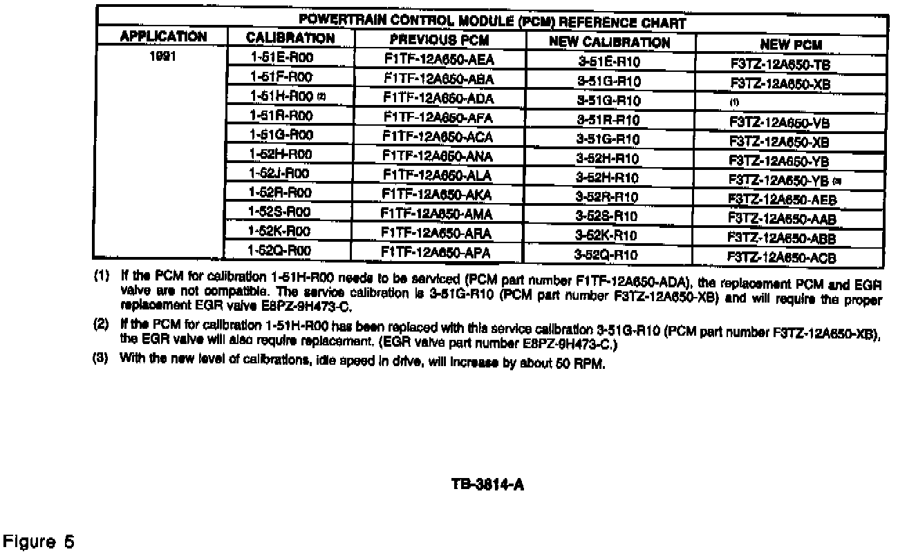 9. If gauge readings at either engine speed are within specifications, and the hesitation/surge condition still exists, reinstall the HO2S (if required, apply a light coat of Loctite Nickel Anti-Seize PN 23508 to the threads of the sensor), reconnect the vacuum hose to the Air Injection Reaction (AIR) Bypass Valve, and replace the PCM. Refer to PCM replacement figure charts (Figures 5 through 8).
