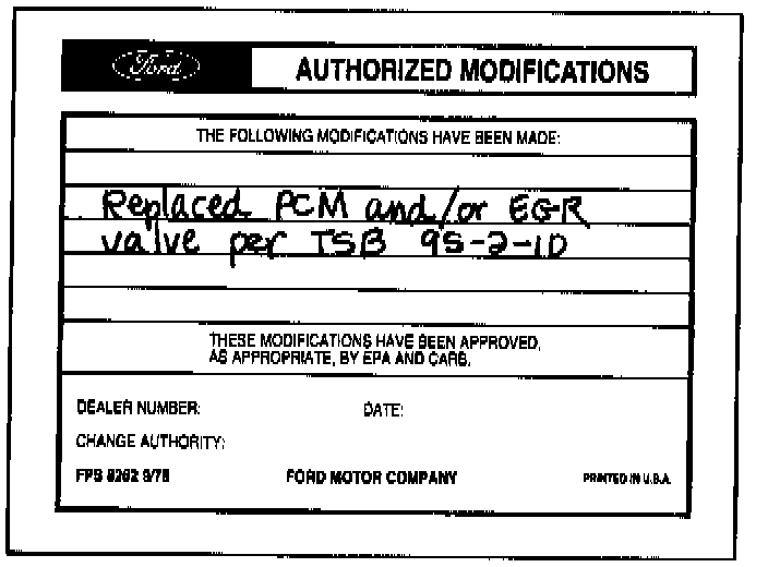Obtain an Authorized Modifications Decal and list the date, dealer number, and summary of alterations performed. Select a prominent place adjacent to the Vehicle Emission Control Information Decal suitable for installing the Authorized Modifications Decal. Clean the area, install the decal, and cover it with a clear plastic decal shield.