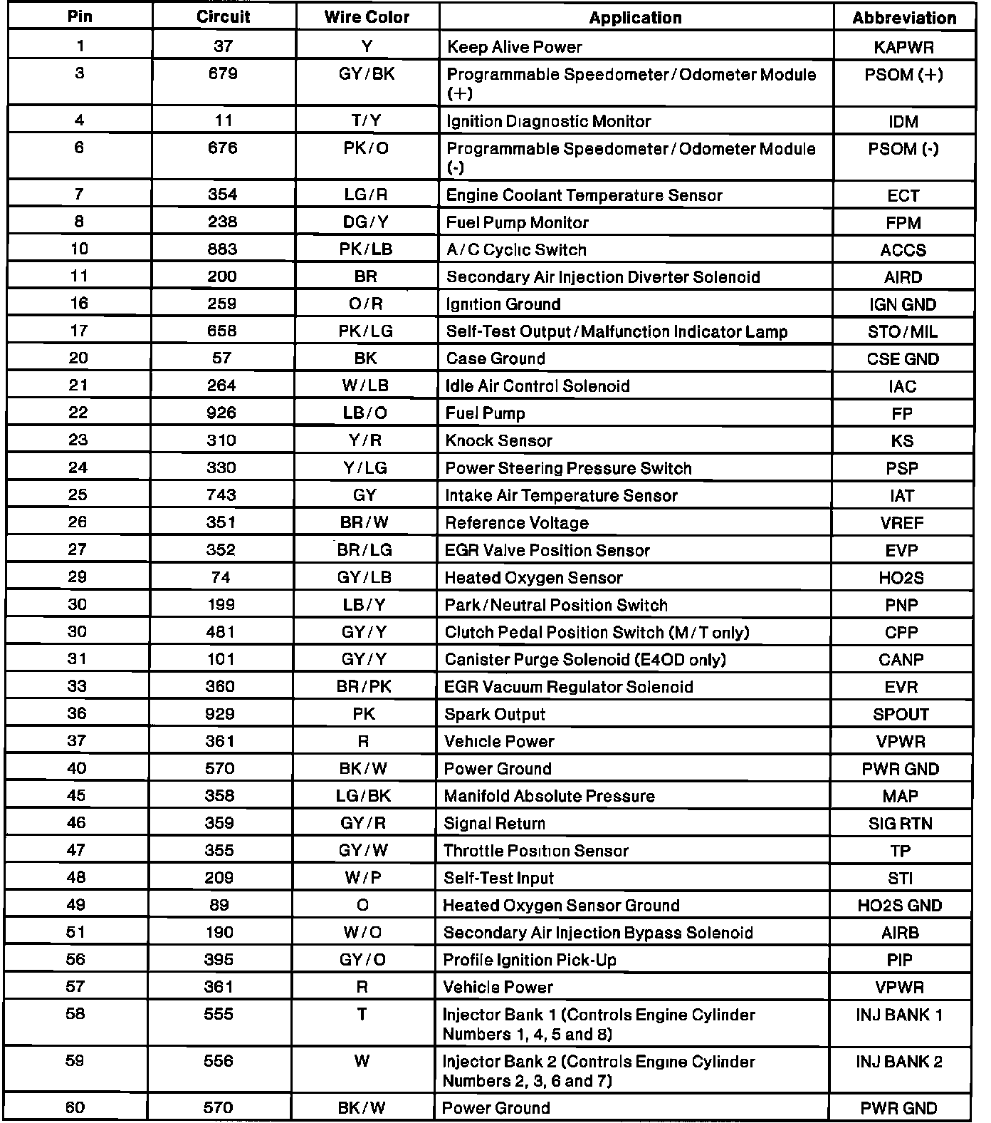 Powertrain Control Module (PCM) Connector Pin Useage: