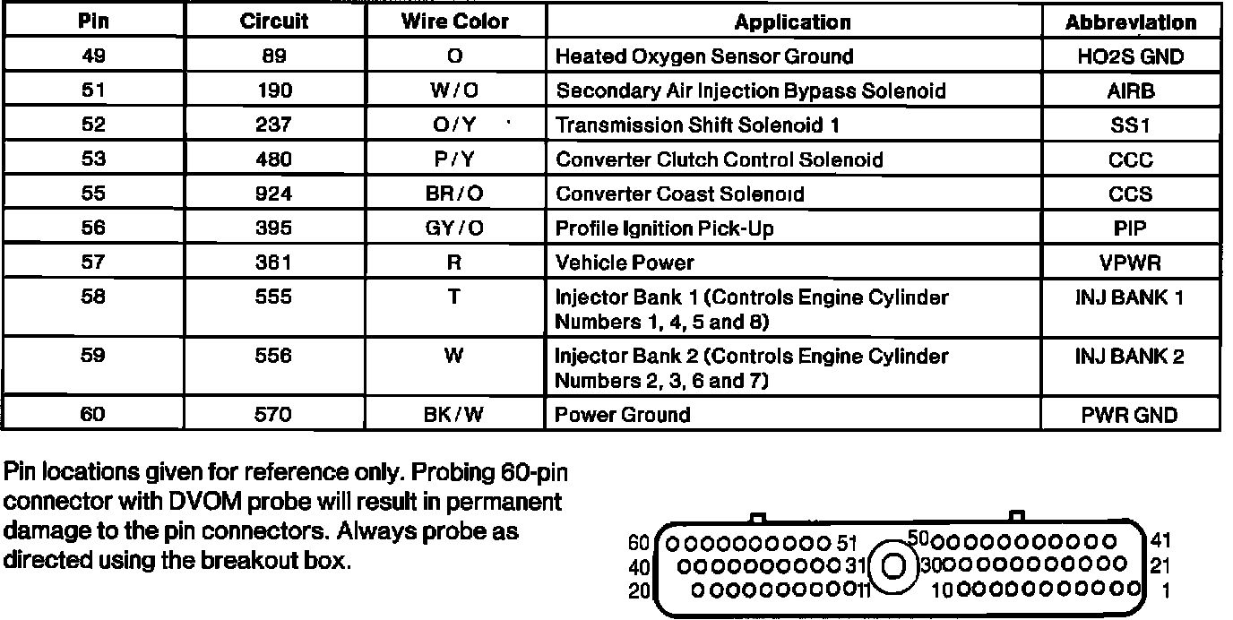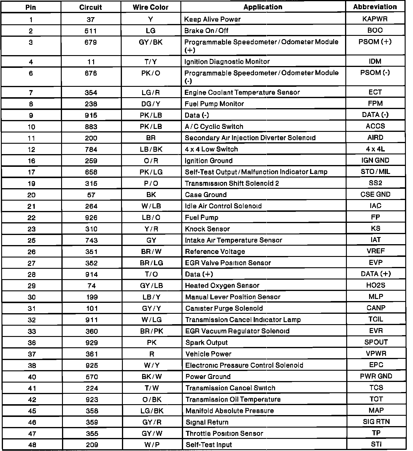 Powertrain Control Module (PCM) Connector Pin Useage: