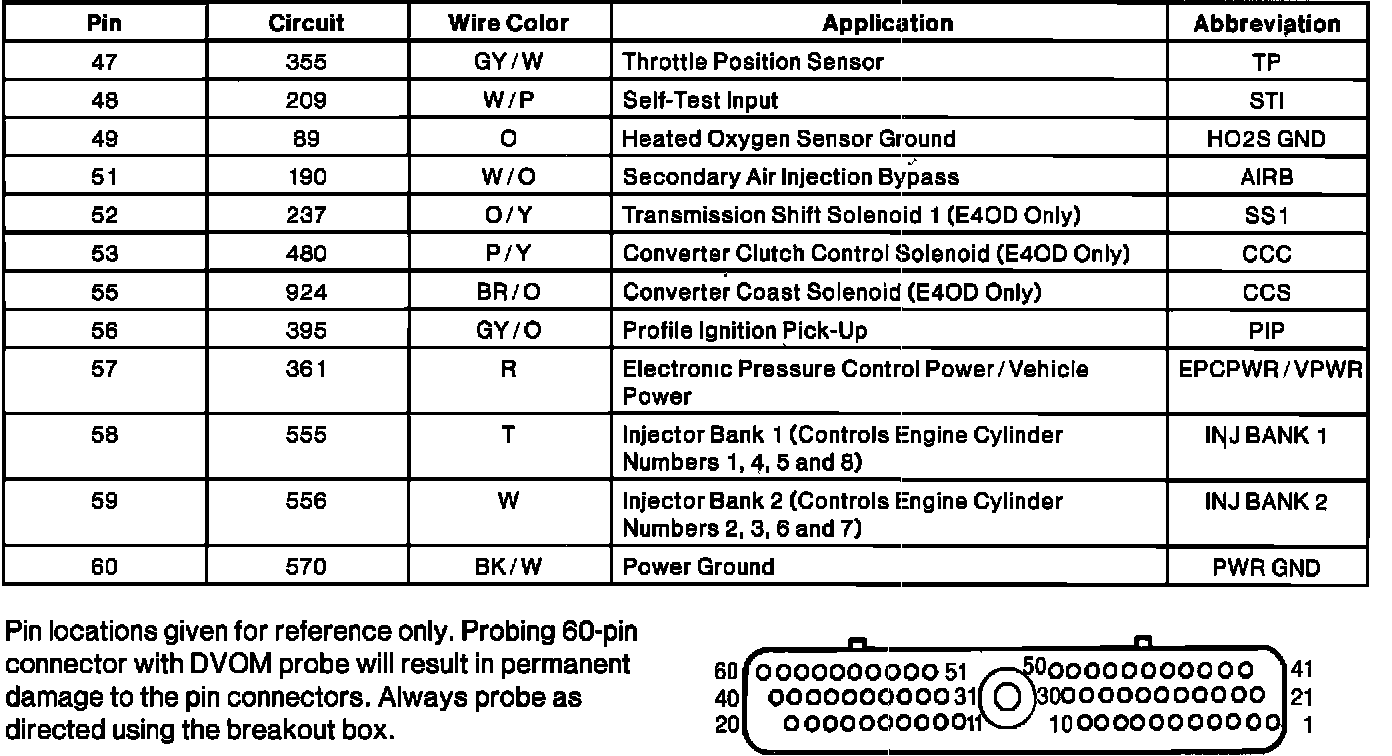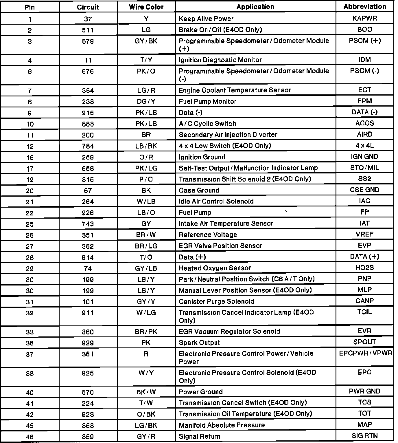 Powertrain Control Module (PCM) Connector Pin Useage:
