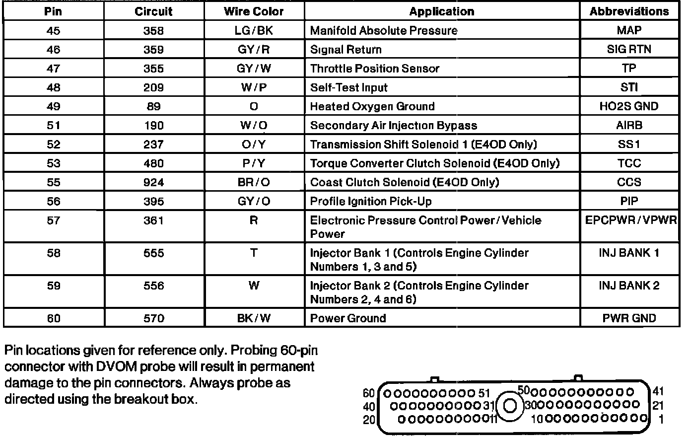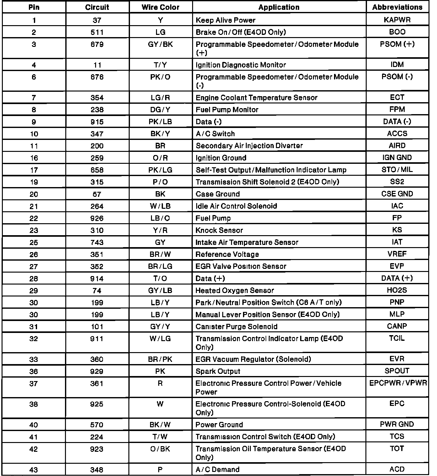 Powertrain Control Module (PCM) Connector Pin Useage: