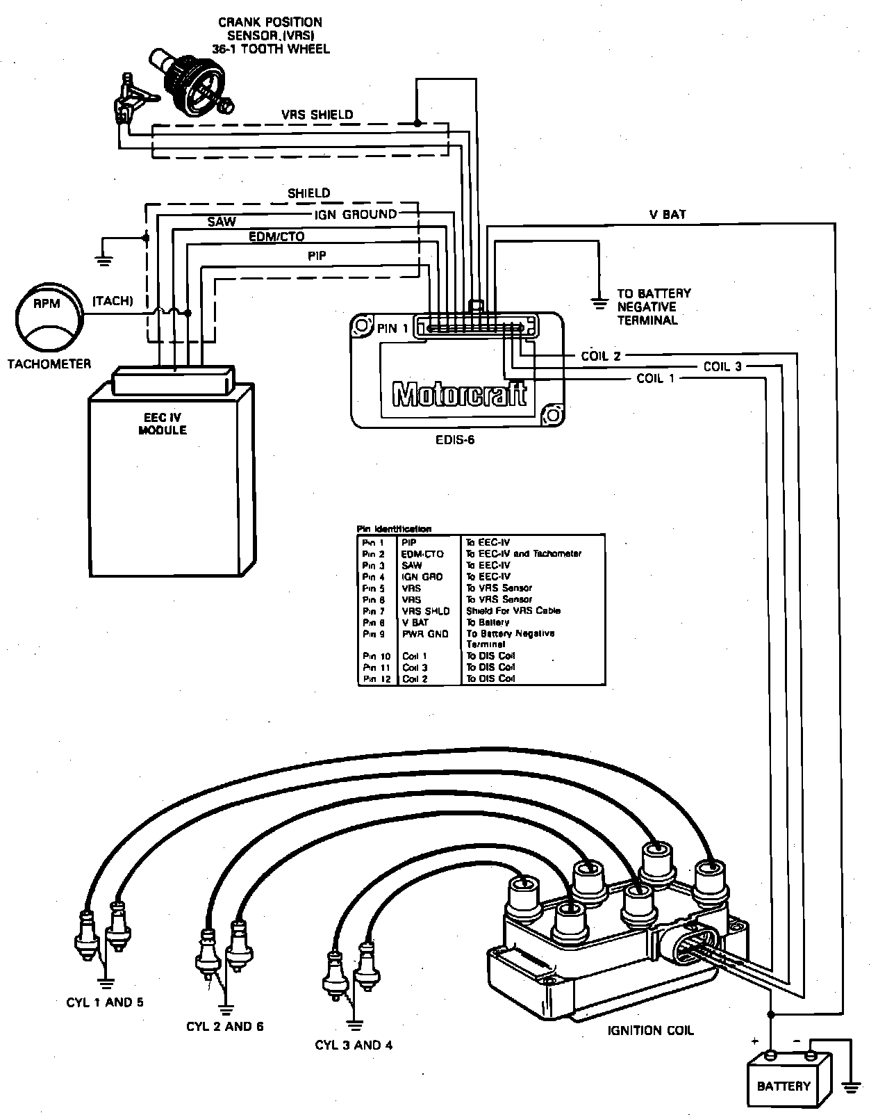 The Electronic Ignition (EI) system consists of a Variable Reluctance Sensor (VRS), an Ignition Module, a Powertrain Control Module (PCM) and one 6-tower Coil Pack.