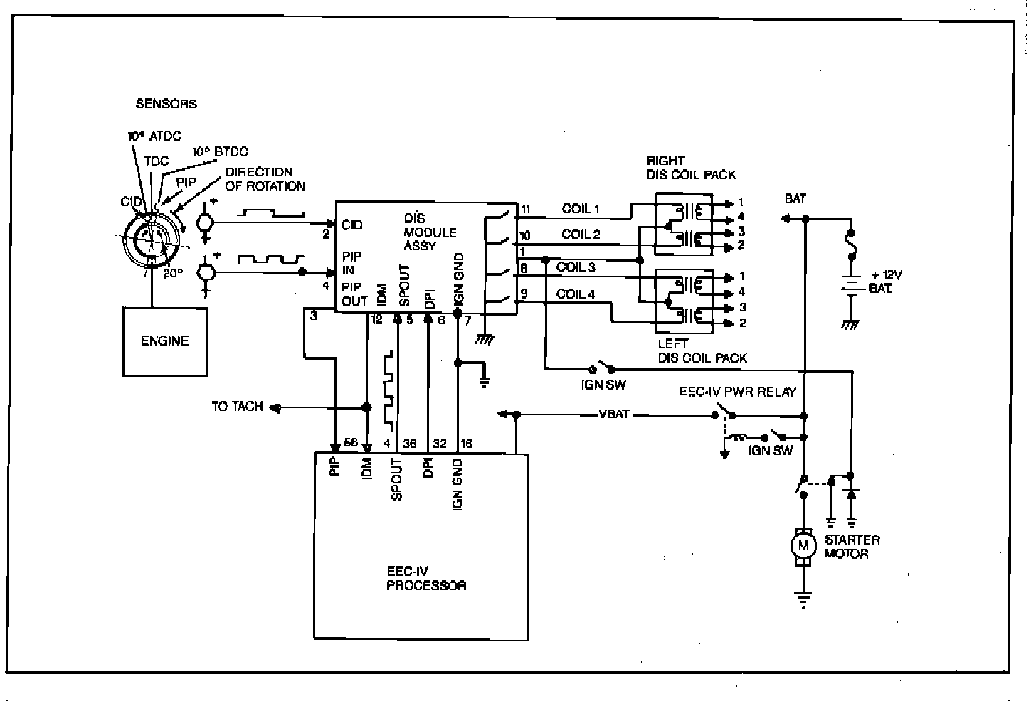 The EI eliminates the need for a distributor by using multiple ignition coils. Each coil fires two spark plugs at the same time. The coils are paired so that as one fires during the compression cycle while the other fires during the exhaust stroke. The next time the coil is fired, the plug that fired on the exhaust stroke will fire on the compression stroke, and the one that was on the compression stroke will fire on the exhaust stroke (the spark in the exhaust cylinder is wasted but little of the coil energy is lost).
