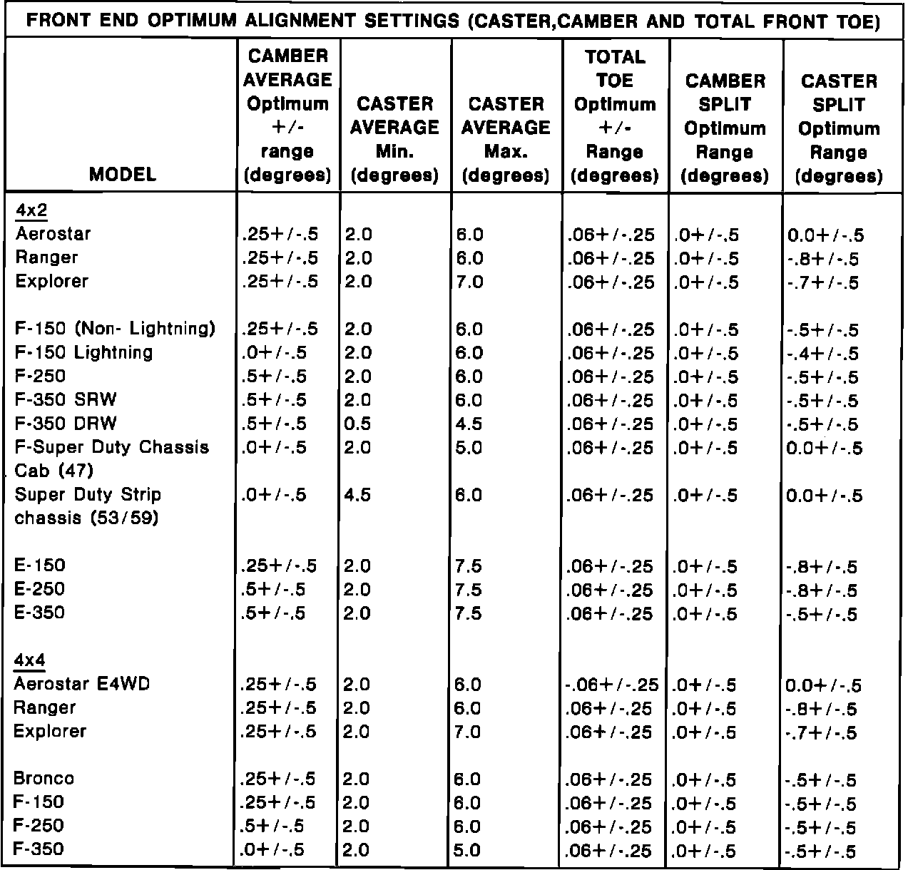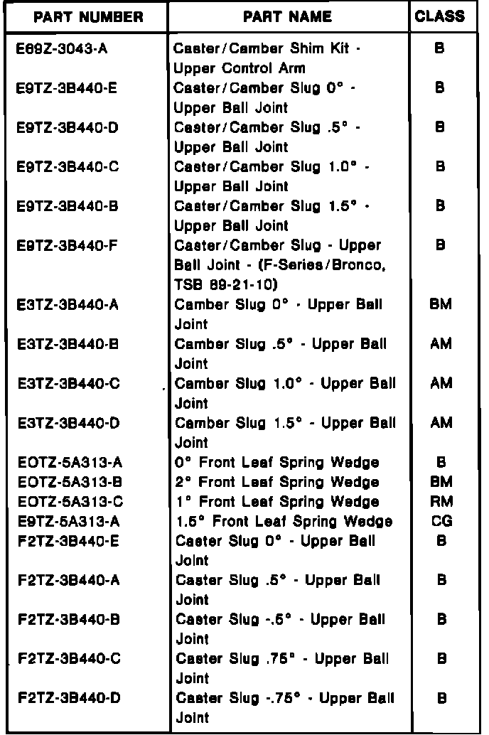 If light truck Service Manual diagnostics indicate the need for front alignment adjustment, use the optimum alignment settings and caster/camber adjustment parts list provided in this TSB Article. Refer to the appropriate light truck Service Manual, Section 04-00 for service details.