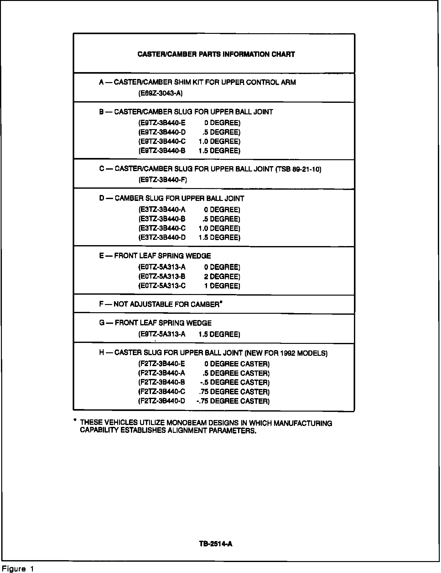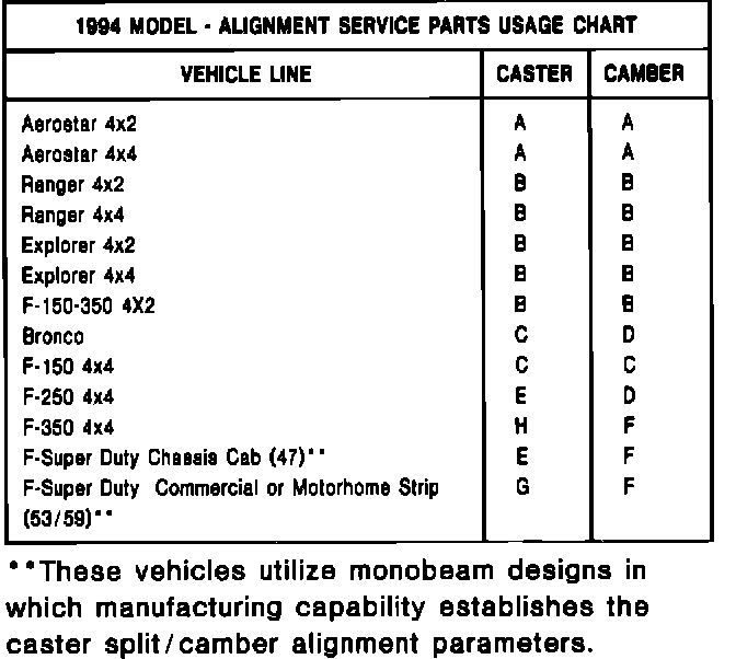 The alignment service parts usage chart provides correct parts usage for each type of vehicle. Select the appropriate parts group from these charts and use the caster/camber parts information chart (refer to Figure 1) to order the parts required.