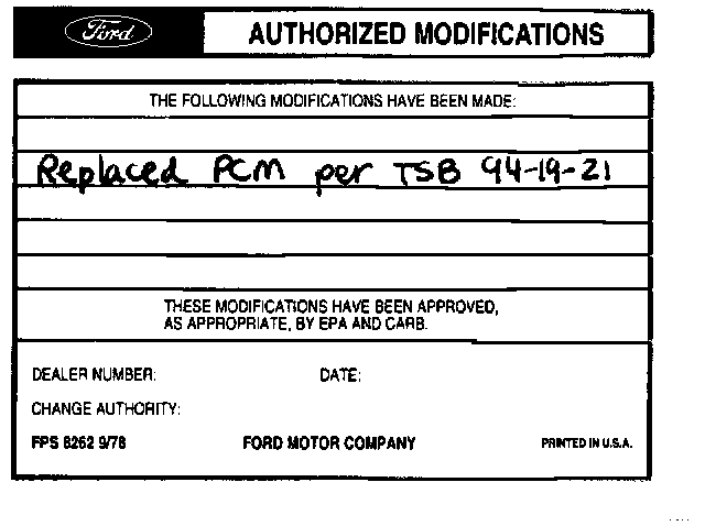 Obtain an Authorized Modifications Decal and list the date, dealer number, and summary of alterations performed. Select a prominent place adjacent to the Vehicle Emission Control Information Decal suitable for installing the Authorized Modifications Decal. Clean the area, install the decal, and cover it with a clear plastic decal shield.