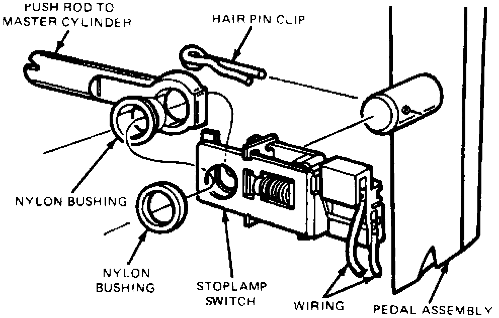 2. Remove hairpin clip, then slide switch, pushrod, nylon washer and bushings away from pedal.