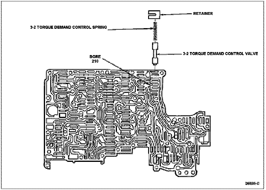 3. Install the separator plate using two tapered punches at locations "E" to align gasket and separator plate-to-valve body. Install three Torx head screws to retain separator plate and gasket to valve body. Tighten screw to 6-8 Nm (53-71 lb-in).