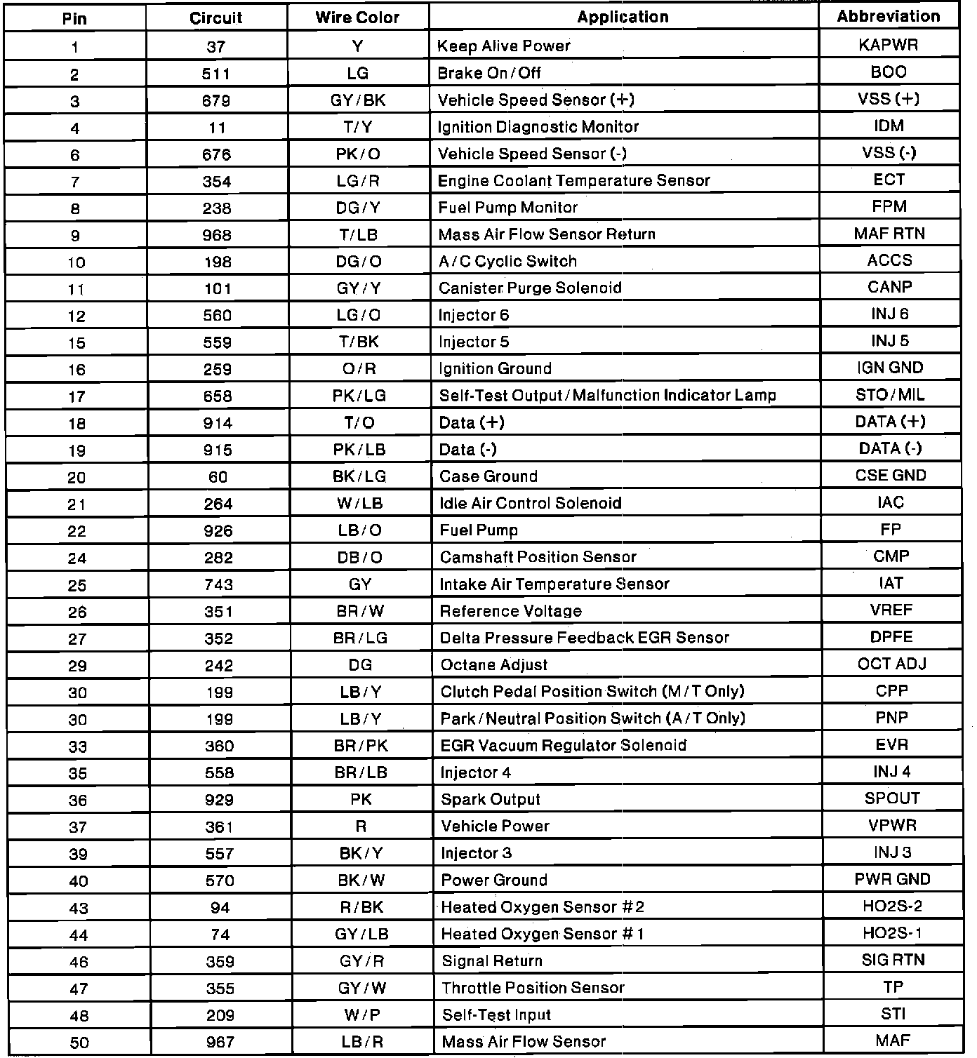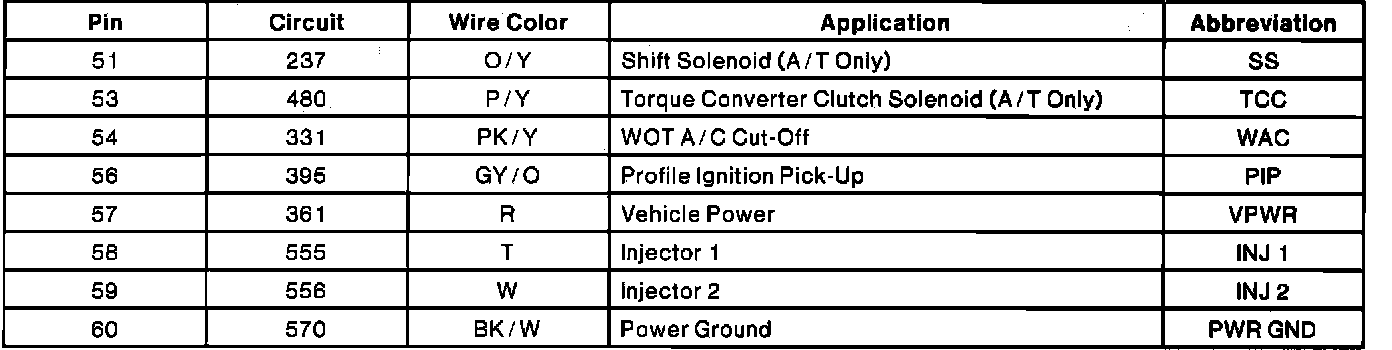 Powertrain Control Module Connector Pin Useage: