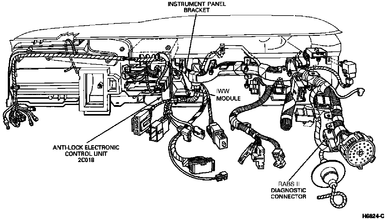 1. Place the anti-lock electronic control unit in position on the instrument panel bracket. Install and tighten the RABS II module retaining screws.