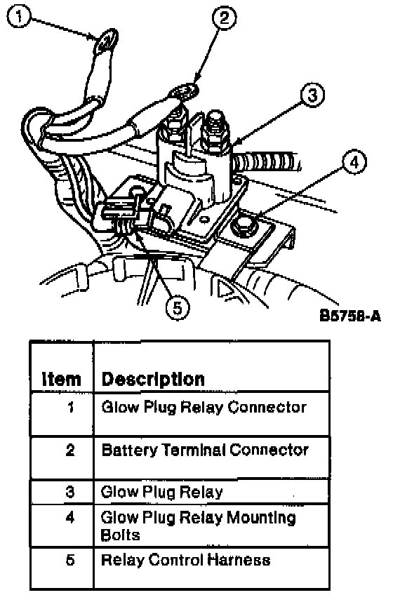 3. Disconnect the battery terminal connector (12 volt power wire), the glow plug relay connector, and the harness connector.