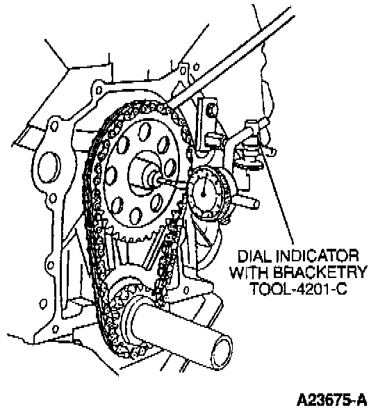 a. Push camshaft toward rear of engine. Install Dial Indicator with Bracketry TOOL-4201-C or equivalent so indicator point is on camshaft sprocket attaching bolt.