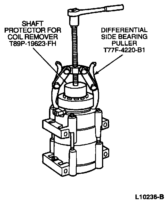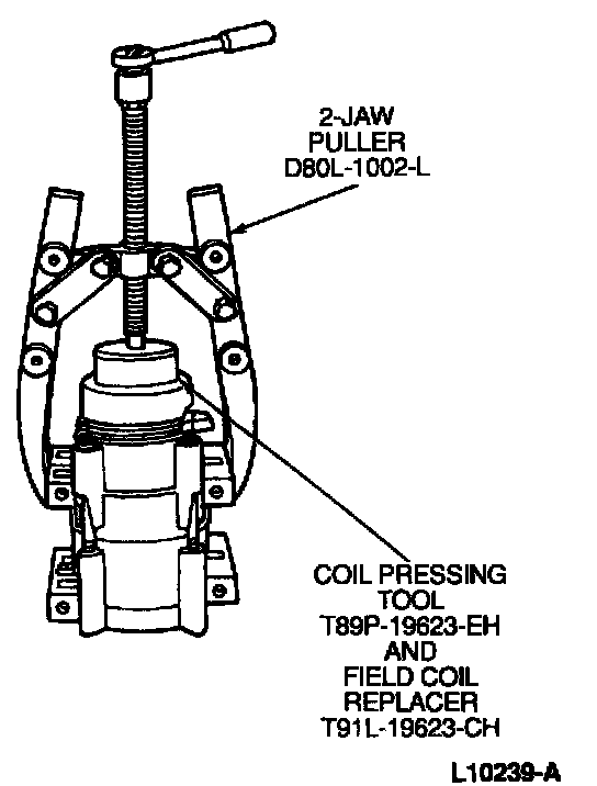 4. Position 2-Jaw Puller Tool D8OL-1002-L or equivalent on the compressor and the Coil pressing tool. The jaws of the puller should be firmly engaged with the rear side of the compressor front mounts. The forcing screw must be piloted on the center mark of the pressing tool.