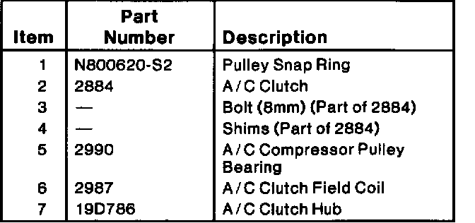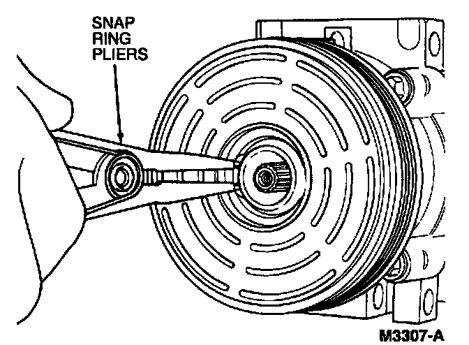 NOTE: Before disassembling the A/C compressor/clutch assembly for repair, it is important to check the A/C clutch air gap. This will help determine it the clutch is not engaging or if the A/C compressor is failing internally. Refer to Adjustments in this section.