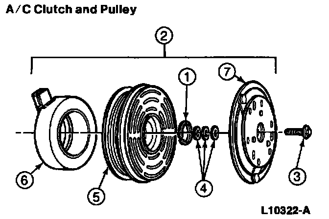 A disassembled view of the A/C clutch and related parts is shown in the illustration.