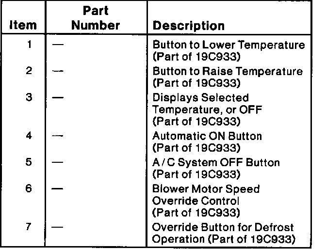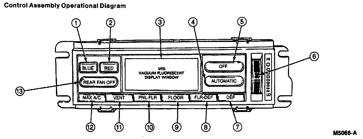 Pressing the AUTOMATIC button turns the system on for fully automatic operation. When functioning automatically, the VFD window will be lighted to show the selected temperature. The system will maintain this temperature by controlling the airflow direction (functional setting), the airflow quantity (fan speed) and the discharge temperature required for comfort. When heating is required, the airflow will automatically be directed through the floor ducts and demisters with a small amount of air through the windshield defroster hose nozzle. During cool weather, the fan operation will be delayed until the engine has heated sufficiently to provide warm discharge temperatures.