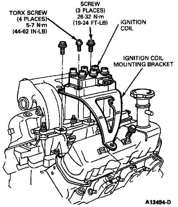 1. Install coil pack and mounting screws. Tighten screws to 5-7 Nm (44-62 in lb).