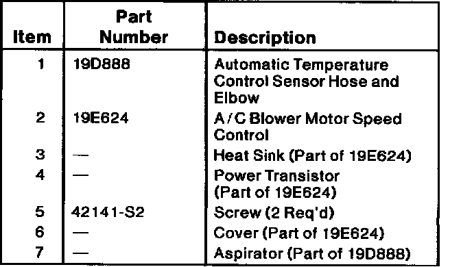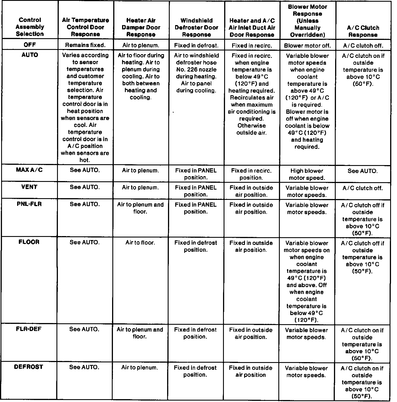 11. Heater and A/C air inlet duct door position. A small DC electric motor or A/C electronic door actuator motor is used to operate the A/C air temperature control door. Vacuum control motors are used to control each of the three remaining air distribution doors. A feedback circuit is used in the A/C electronic door actuator motor to supply the control assembly with A/C electronic door actuator motor position information. The blower motor is controlled by the A/C control through the A/C blower motor speed control. The A/C blower motor speed control is required to react to low power signals from the A/C control to provide the high current ground required to drive the blower motor. The following table shows the control assembly response to the function control selections.