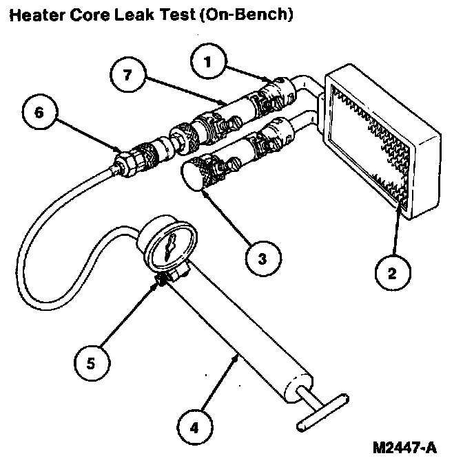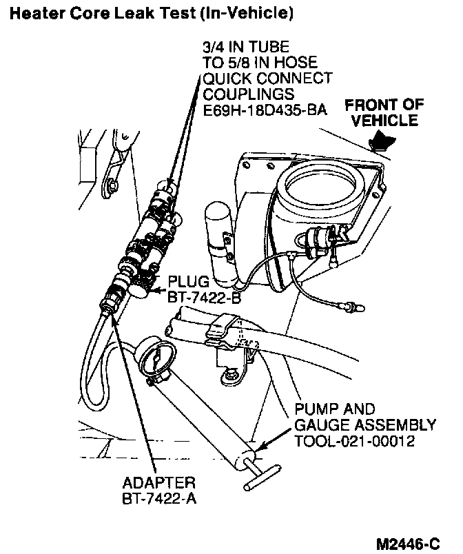 If the pressure drops, check the coupling or hose connections to the core tubes for leaks. If the couplings or heater water hoses do not leak, remove the heater core from the vehicle and bench test the heater core.