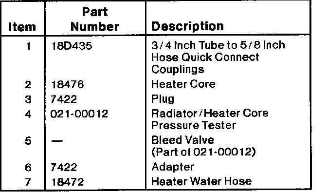 3. Apply 206 kPa (30 psi) of air pressure to the heater core with Radiator/Heater Core Pressure Tester 021-00012 or equivalent and submerge the heater core in water.