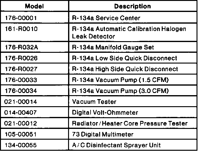 R-134a systems require the use of special servicing equipment designed specifically for R-134a systems. R-12 servicing equipment cannot be used when servicing R-134a A/C systems. R-134a special service equipment includes R-134a recovery/recycling/recharging station, R-134a leak detector, R-134a vacuum pump and R-134a manifold gauge set.