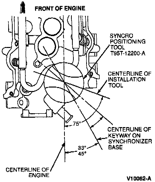 7. With the synchronizer flange fully seated against the block, the tool should point rearward 33 to 45 degrees counterclockwise off engine centerline.