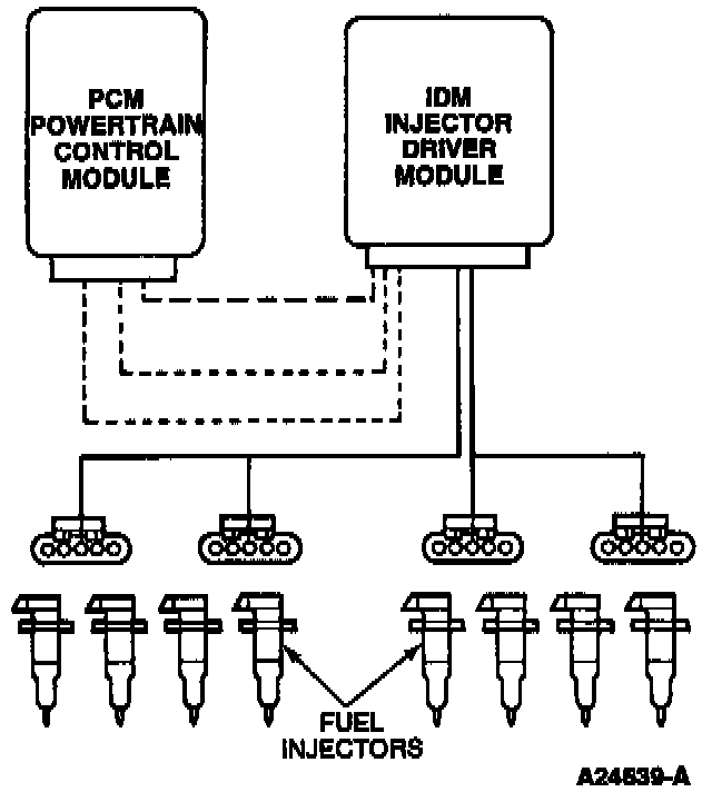 The Injector Driver Module (IDM) is used in conjunction with the Powertrain Control Module (PCM) to sequentially control power to the fuel injectors on the 7.3L Direct Injection (DI) turbo diesel engine. The PCM processor generates two digital control signals for the IDM: Fuel Delivery Control Signal (FDCS) and Cylinder Identification (CID). The FDCS signal is used by the IDM to control injection timing and injection duration. The CID provides synchronization to the engine's first and fifth injector (firing order). The IDM verifies that FDCS and CID occur at valid timing intervals. The IDM outputs an Electronic Feedback (EF) signal, to the PCM, which is a delayed mimic of the FDCS for verification. Selected diagnostic information is also passed to the PCM via the EF signal in run mode.