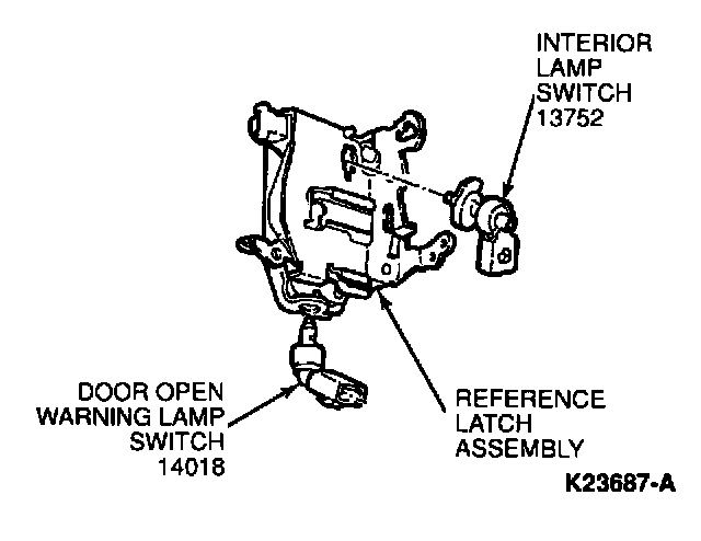 The interior lamp switch (13752) is a grounding type leaf switch and is attached to the front door latch (21812) by one screw.