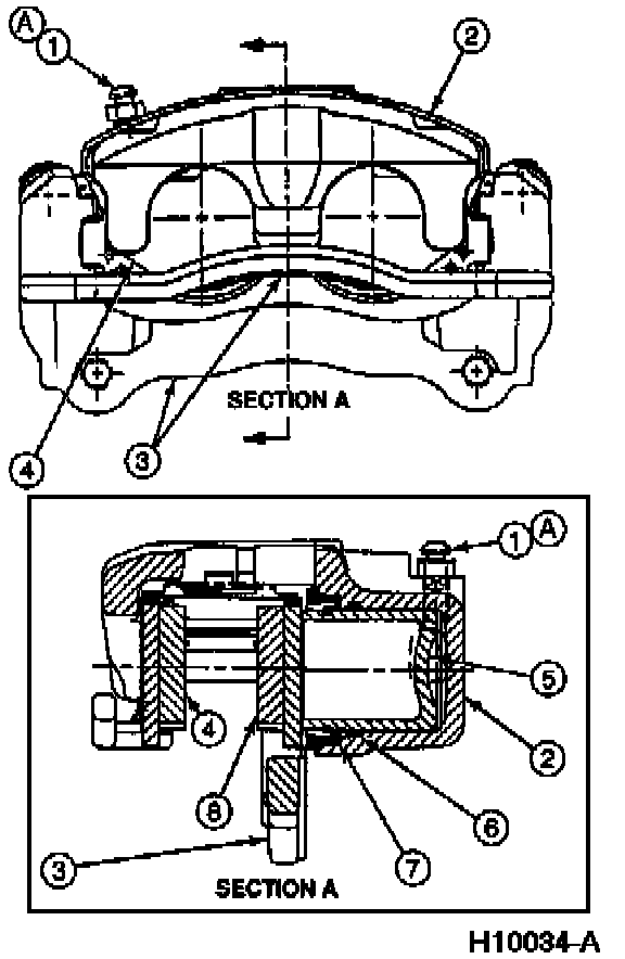 1. Clean and inspect the disc brake caliper bores for scoring, rust, pitting or other damage. Do not hone a worn or damaged caliper bore. A new disc brake caliper must be used.