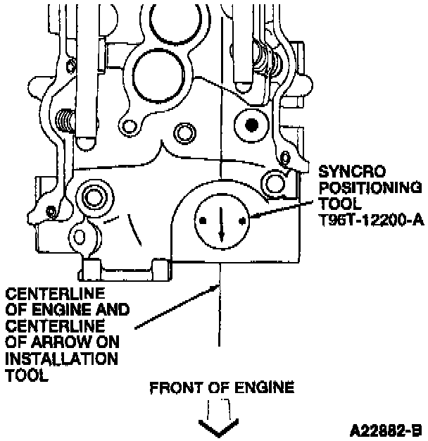 5. Install camshaft synchronizer into cylinder block making sure that arrow on Syncro Positioning Tool T96T-12200-A is pointing forward parallel to center line of crankshaft. This step will locate camshaft position sensor electrical connector to the pre-removal position.
