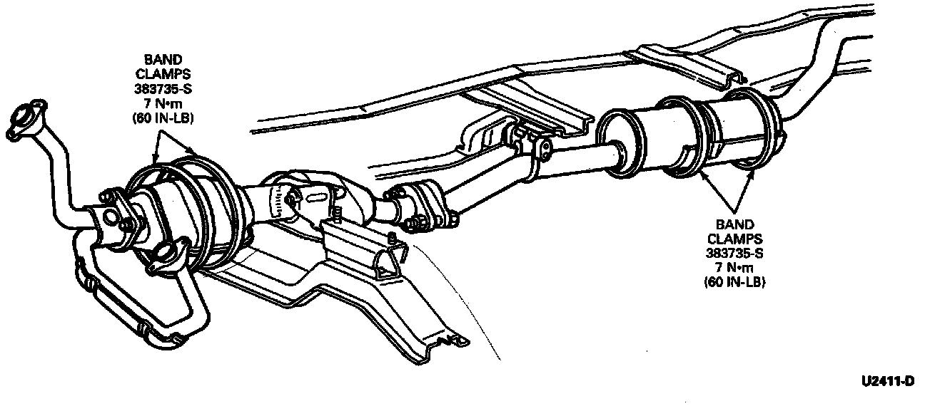 2. Align the clamp to secure the heat shield to the muffler or TWC. Tighten the clamp to 7.0 N.m (60 lb in).