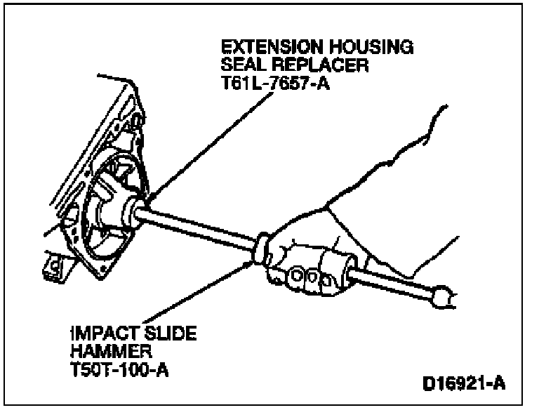 2. Thread Impact Slide Hammer T50T-100-A into Extension Housing Seal Replacer T61L-7657-A through the back of the case. Install the rear case bushing.