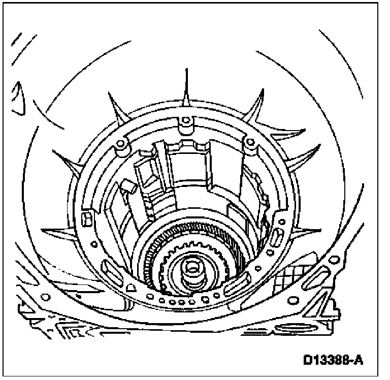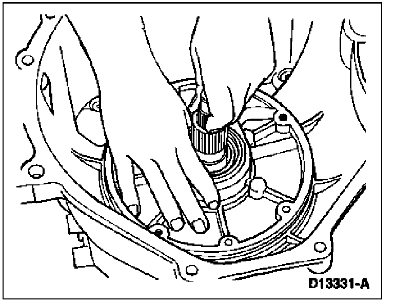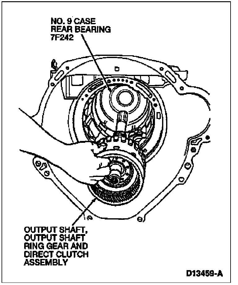9. Rotate the output shaft, if necessary, to align the planetary assembly splines with the direct clutch hub splines.