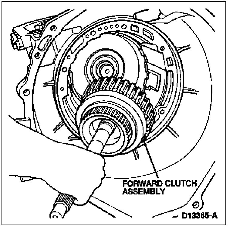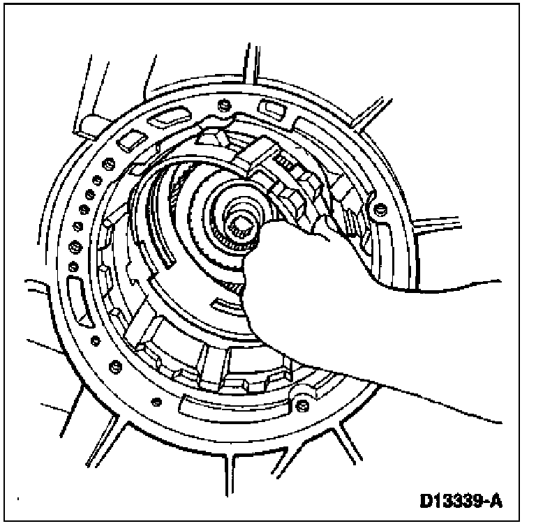16. NOTE: Wiggle the input shaft while engaging the reverse clutch splines. Make sure the reverse clutch cylinder lugs are completely seated in the notches of the reverse sun gear.