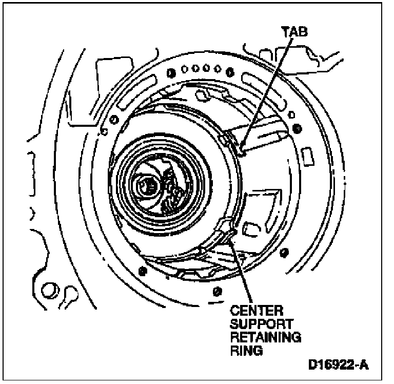11. Install center support retaining ring. Reference retaining ring end tab to anchor pin location.