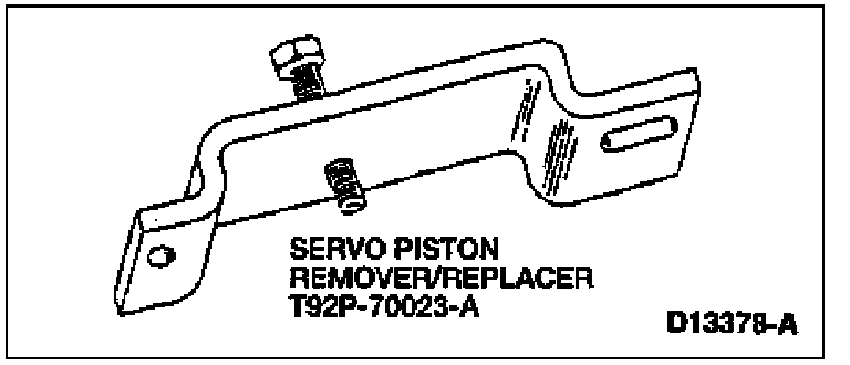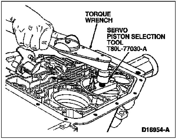 c. Install Servo Piston Selection Tool T80L-77030-A. Tighten the band apply bolt on Servo Piston Selection Tool T80L-77030-A to 5.6 Nm (50 lb-in).