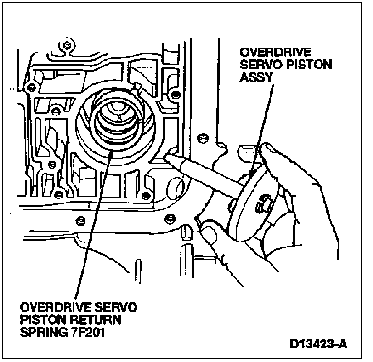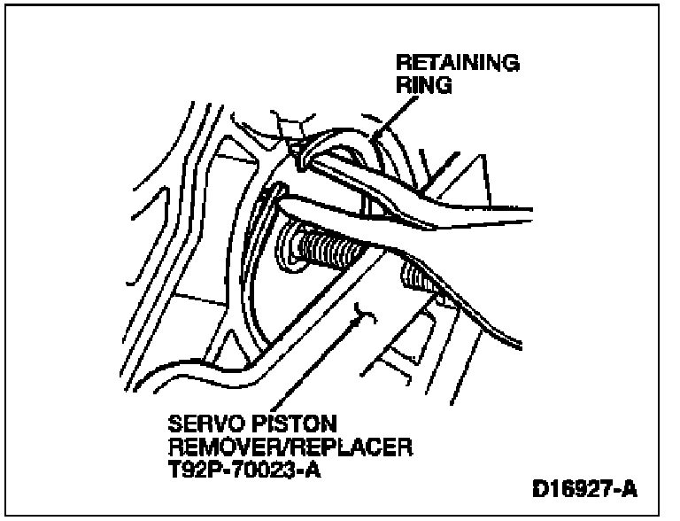17. Install overdrive band over reverse clutch assembly and position the pocket of the overdrive band against overdrive band anchor pin. Install overdrive servo piston return spring and overdrive servo piston assembly. Verify tip of piston assembly engages the pocket of overdrive band. Using Servo Piston Remover/Replacer T92P-70023-A, install piston assembly into the case and compress overdrive servo piston return spring.