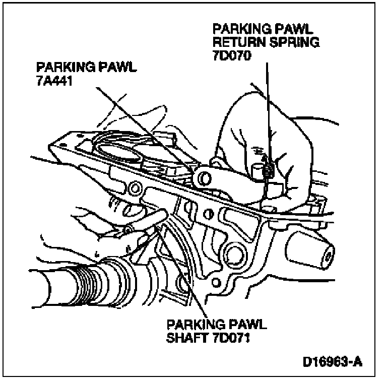 29. Place transmission in the horizontal position. Install parking pawl and parking pawl return spring. Slide parking pawl shaft into case through parking pawl.