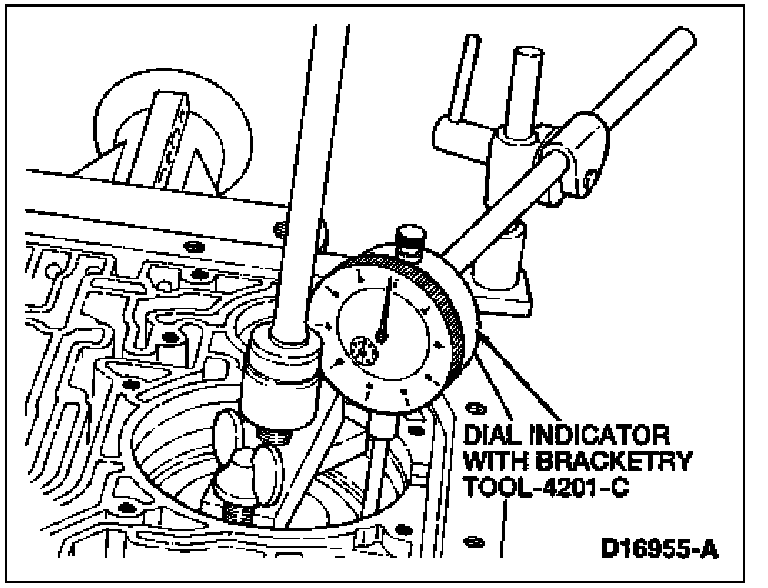 23. Position the Depth Micrometer D80P-4201-A or equivalent on Gauge Bar T80L-77003-A so that the depth is measured at the reverse clutch drum thrust face. Check the end play 180 degrees opposite to determine the average depth.