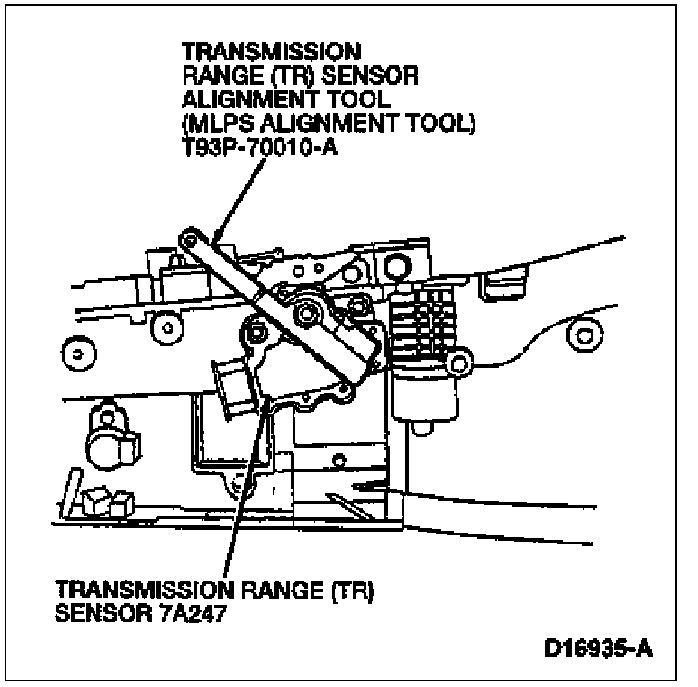 Position manual control lever in NEUTRAL. Insert Transmission Range (TR) Sensor Alignment Tool (MLPS Alignment Tool) T93P-70010-A into slots. Align all three slots on TR sensor with three tabs on tool.