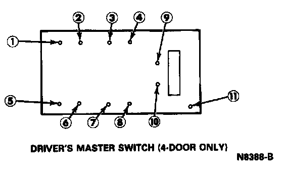 2. With the window regulator control switch in the NEUTRAL position, there should be continuity between terminals 1, 2, 3, 4, 5, 6, 7, 8 and 9 and terminals 10 and 11.