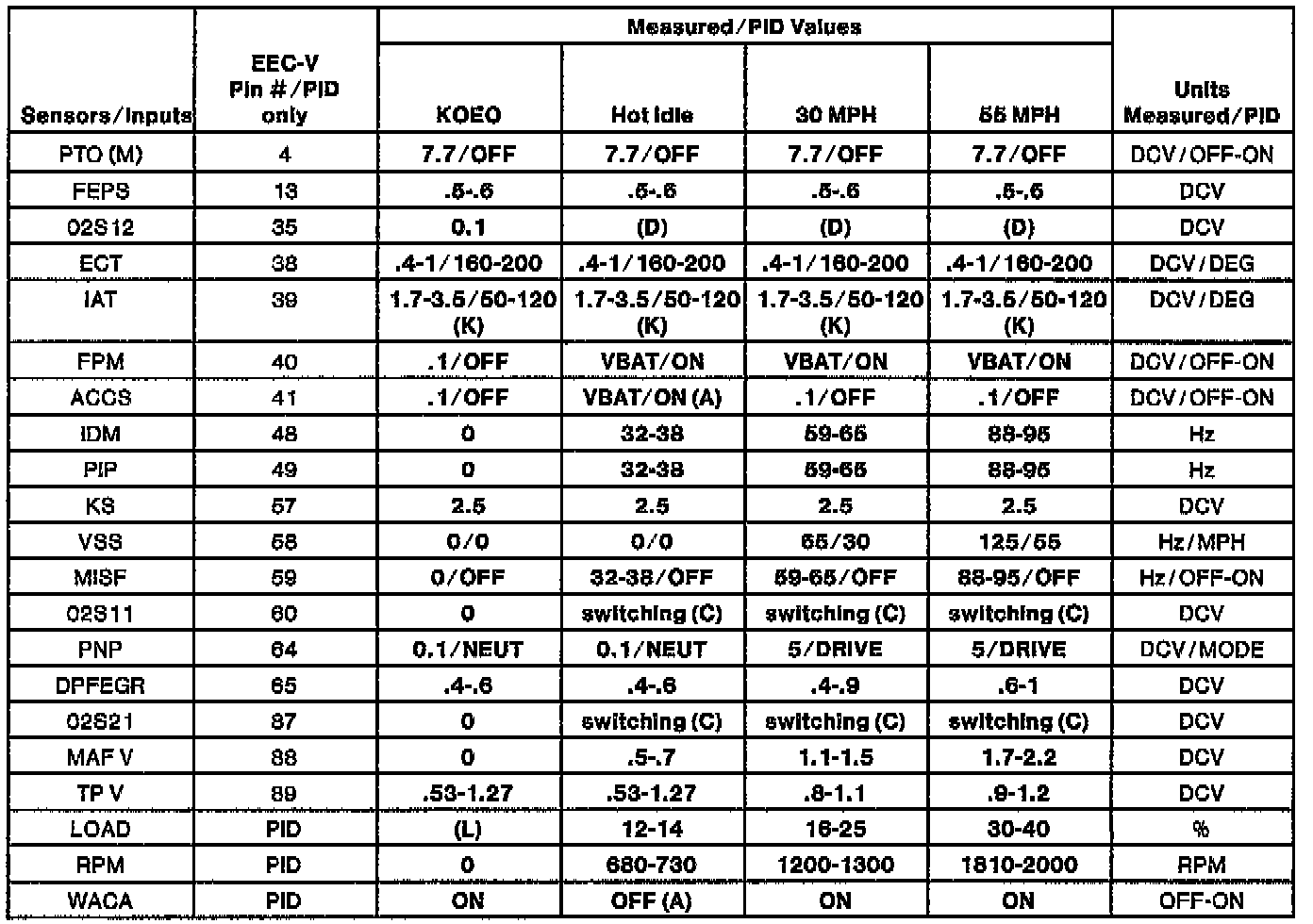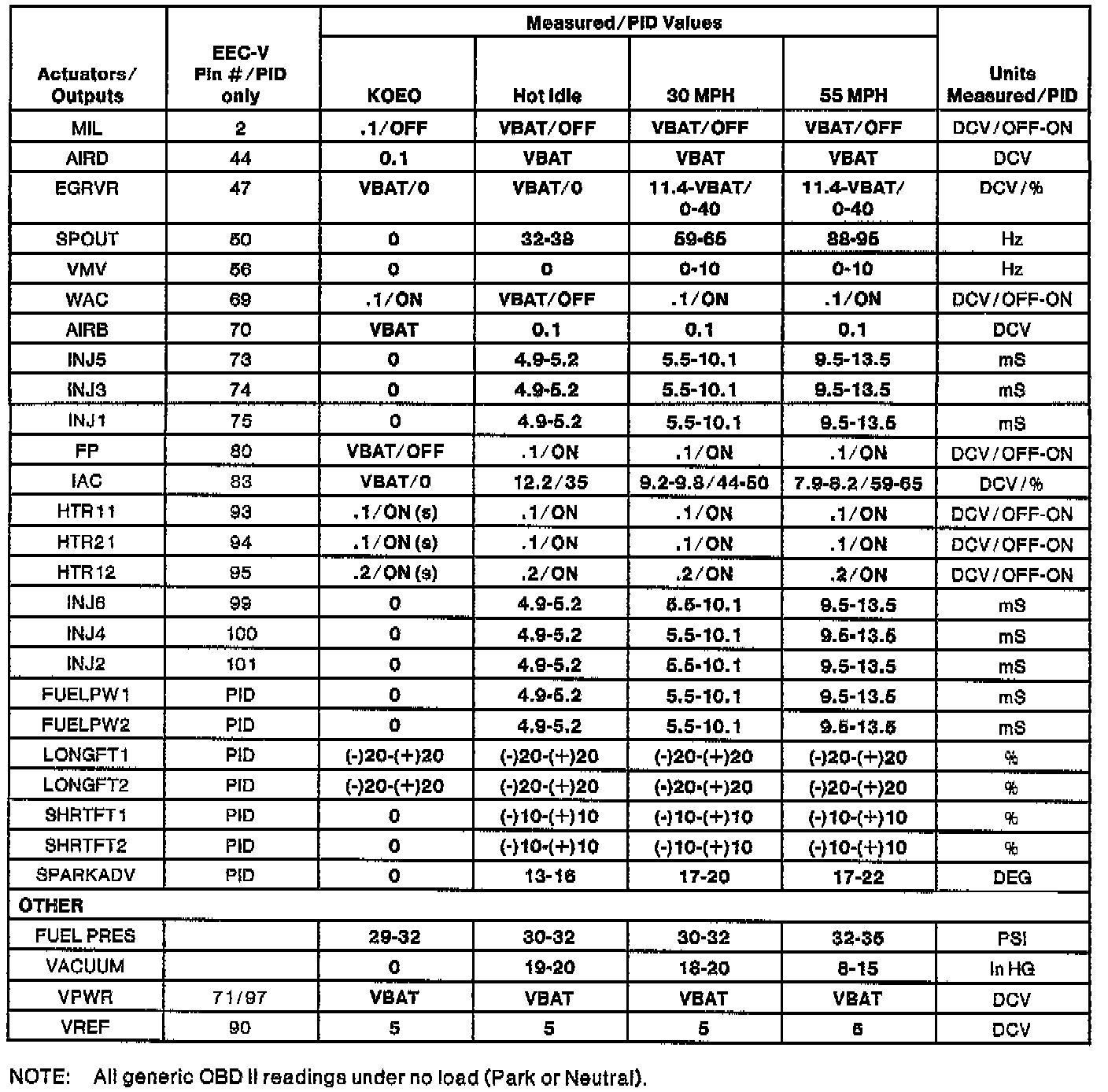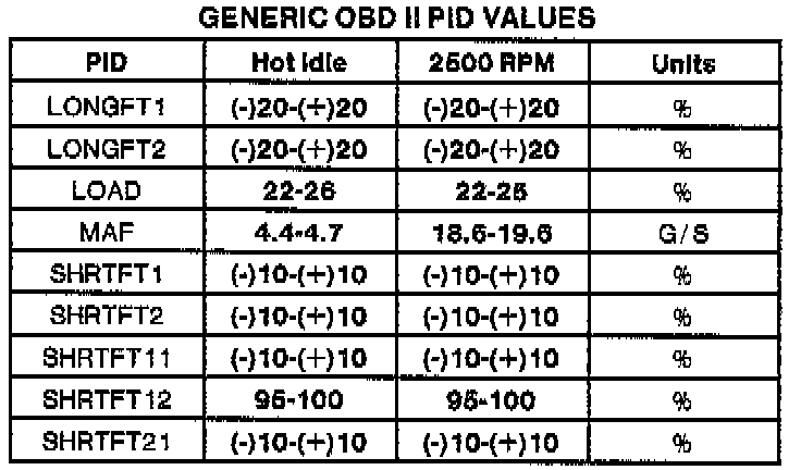 NOTE: All generic OBDII readings under no load (PARK or NEUTRAL).