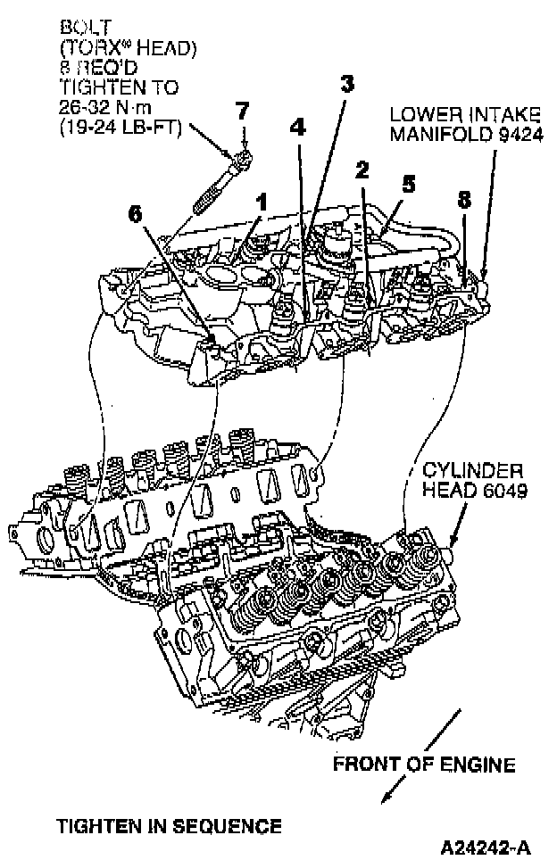 20. Remove lower intake manifold retaining bolts using a Torch head socket. Before attempting to remove intake manifold, break seal between intake manifold and cylinder block. Wedge a large pry bar or similar tool between intake manifold and cylinder block. Pry upward on tool using area between water hose connection and transaxle as a leverage point.